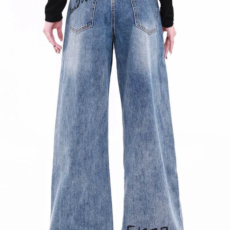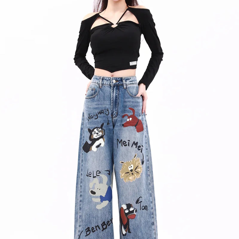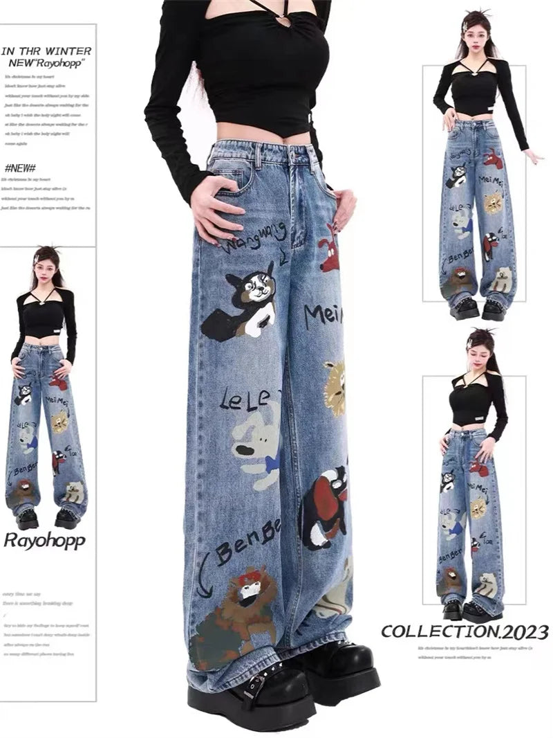 Autumn Winter Baggy Jeans Woman American High Street Straight Tube Women's Jeans Cartoon Print Women Pants High Waist